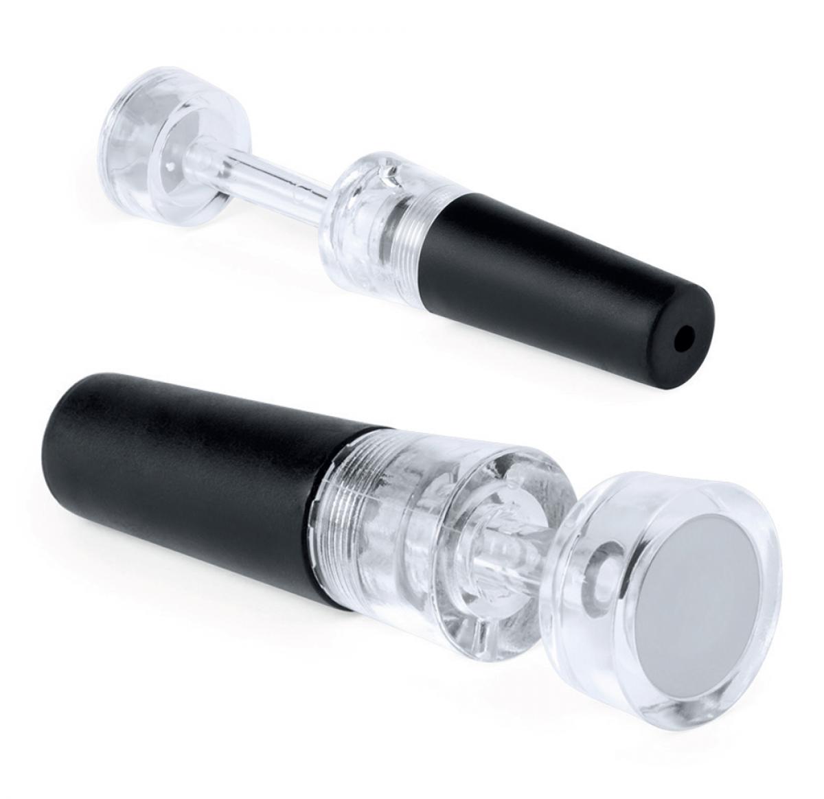 Vaccum lid for wine bottles in an elegant, black colour and transparent design. Upper side of the lid in metal for laser or pad printing. Presented in an individual box.