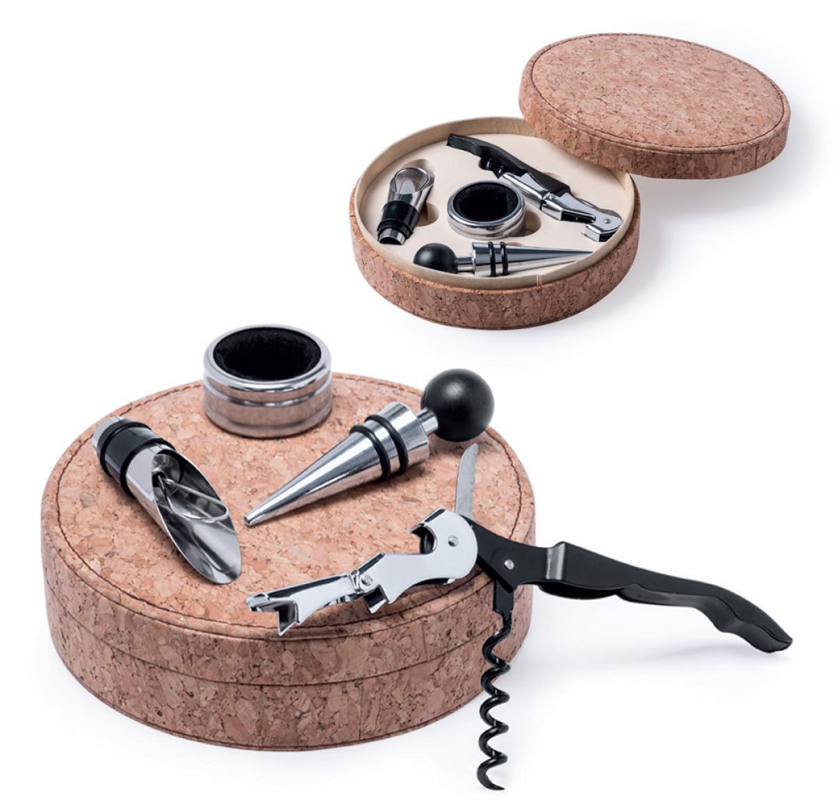 Wine set of elegant circular design with natural cork finishing. Stainless steel accessories, including dual lever corkscrew with capsule cutter and opener, stopper, dispenser and drip stop.Presented in an individual case with soft foam inside, embossed, in beige colour.