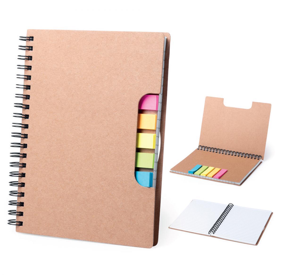 Ring notepad with recycled cardboard covers. Bold cover design, with a die-cut showing the colours of the inside adhesive notes. Including inside notepad with 60 sheets in a striped layout and 125 mini adhesive notes.