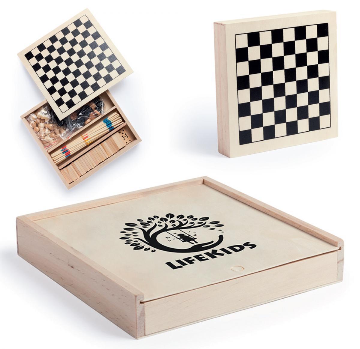Set of games in wood material. Including mikado, chess, draughts and domino. Presented in a wooden case with lid board. Board with plain side for logo.