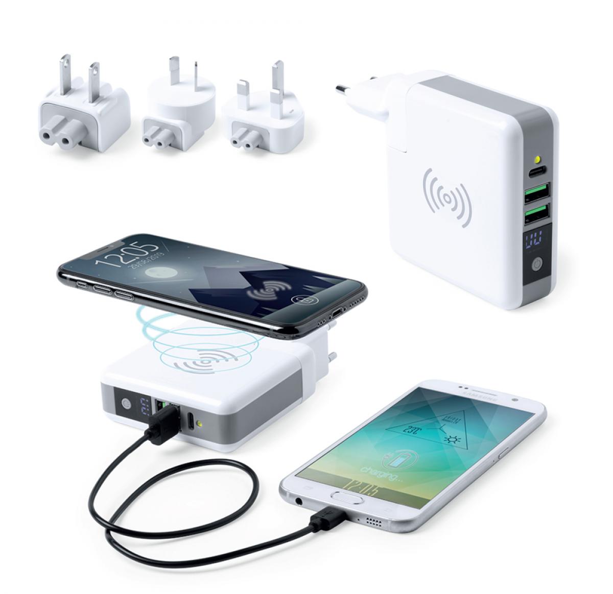 Wireless, multi-function and multi-output travel adapter with 6,700 mAh charging capacity integrated power bank. In an elegant white colour design, with a wide printing area. Wireless charging function, including dual, Type-C, 3,000 mA input-output connection and 2 USB outputs of 2,000 mA. LCD screen with charging status indicator and wall pugs for the USA, Europe, Asia, UK and Australia. Simultaneous working flow for all functions. Presented in an attractive, individual, design box.
