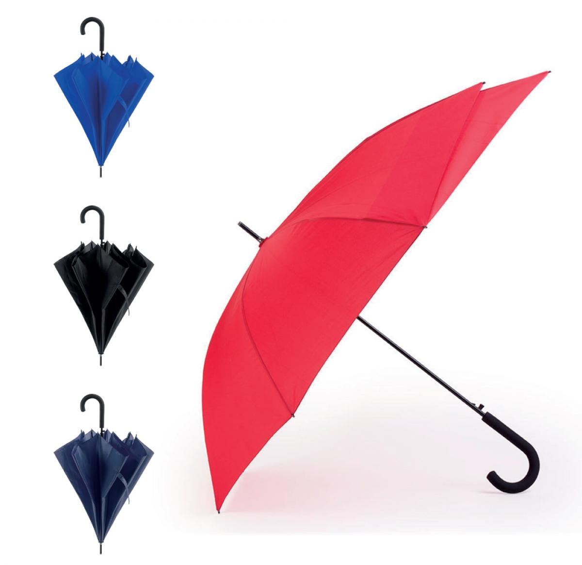 8 panel, expandable umbrella in pongee material. 105cm diameter, with windproof system. Including expansion in self material to keep the backpack away from the rain. Manual opening, with fiber ribs and curved handle, available in a wide range of colours.