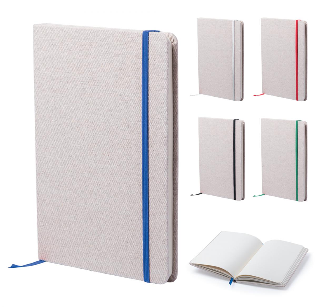 Notepad in natural materials. Covers in soft, natural colour cotton. With elastic closure band and bookmark in matching, eye-catching colours. Including 80 plain sheets.
