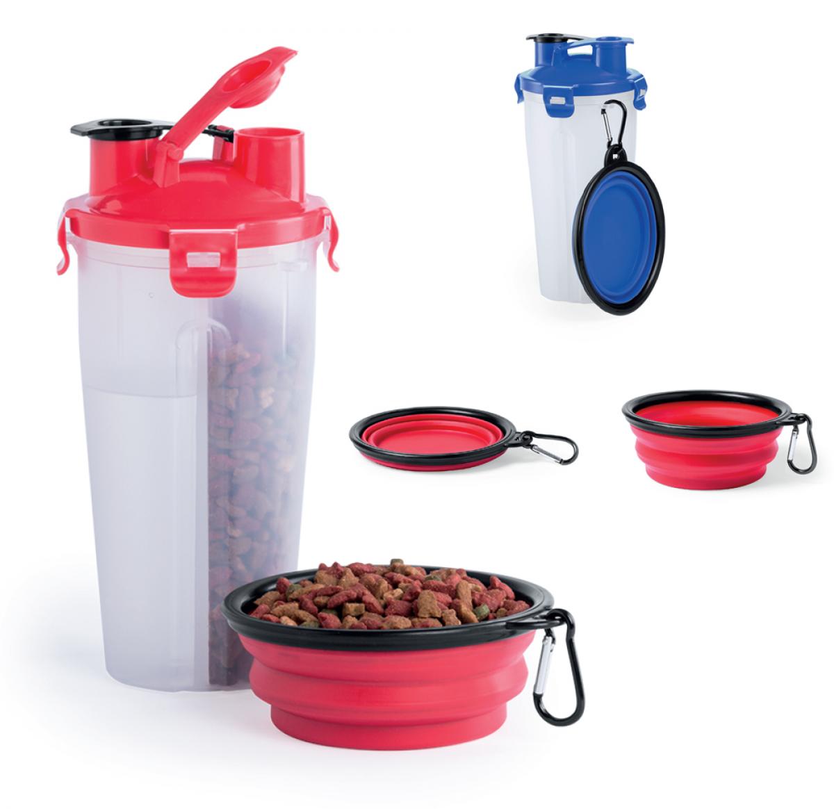 Set for pets food. Including a handy bottle with 2 compartments -food and liquids- and security lids. Folding bowl in matching colour, with metal carabiner.