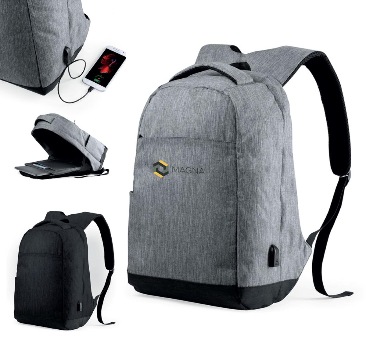 Anti theft, business backpack in high quality 600D polyester, water repellant, cut and wear resistant. Available in grey and black finishing. Anti theft pocket at the back for keeping valuable objects. Inside compartment with USB output for powerbank connection -not included-. Security zipper, 2 padded, inside, independent, compartments for laptops up to 15 inches and tablets up to 10 inches. Wide range of inside and outside pockets. Shoulder and back straps with ergonomic padding. Including trolley fitting accessory.