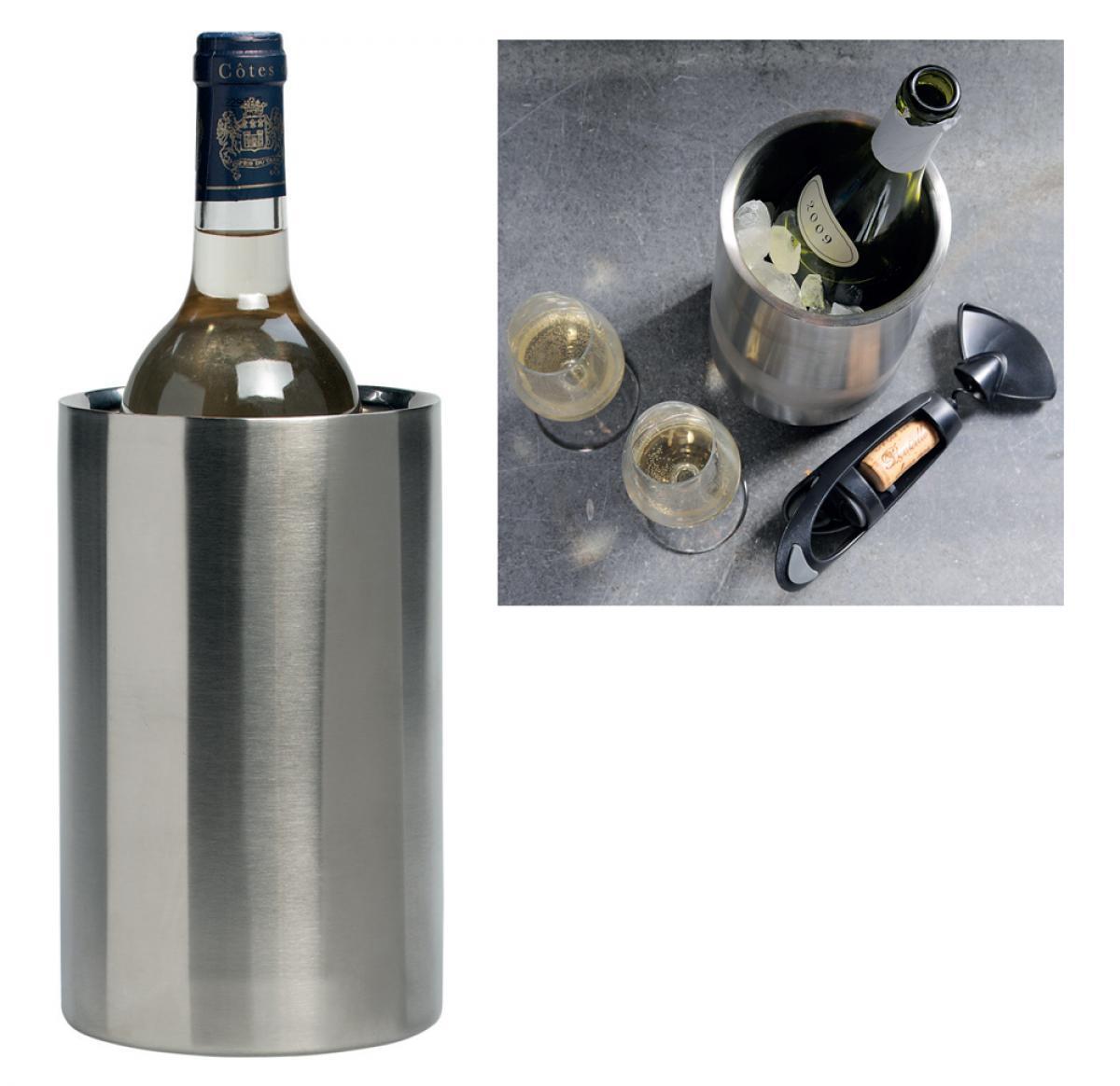 Stainless steel double walled wine cooler. Perfect house warming or birthday present. Holds 1 bottle of wine. Individually boxed.