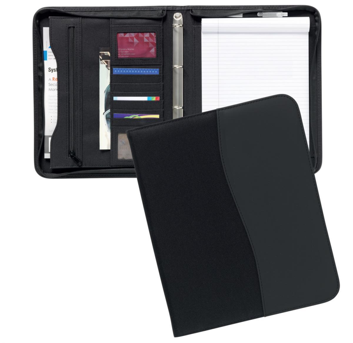 Zipped 600D Polyester A4 conference folder with 4 ring binder and various pockets. Accessories include writing pad and ballpoint pen. Great for travelling business executives and professionals.