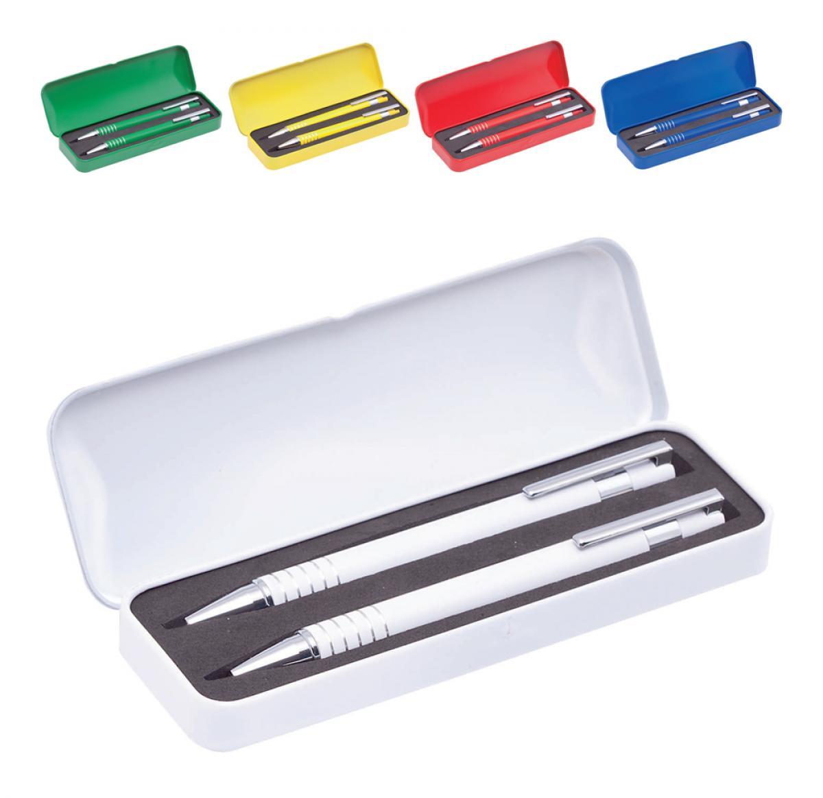 Metal retractable pen and pencil set with blue ink and silver trim. Gift box included.
