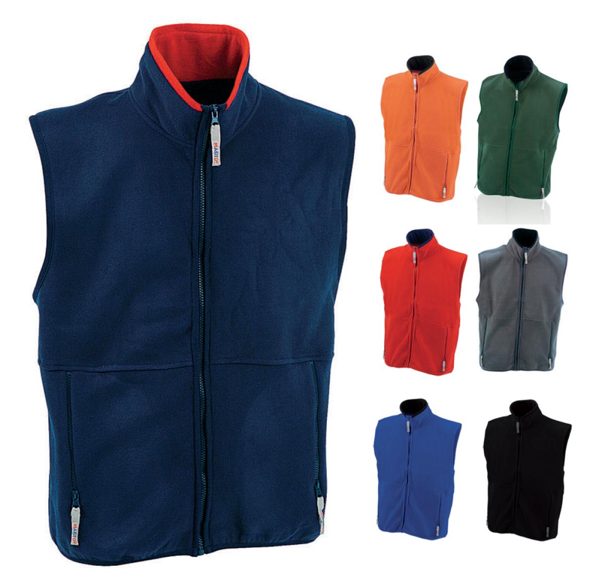 Fleece vest with contrasting collar, zip closure and two zipped fornt pockets. Available in M, L, XL, XXL.