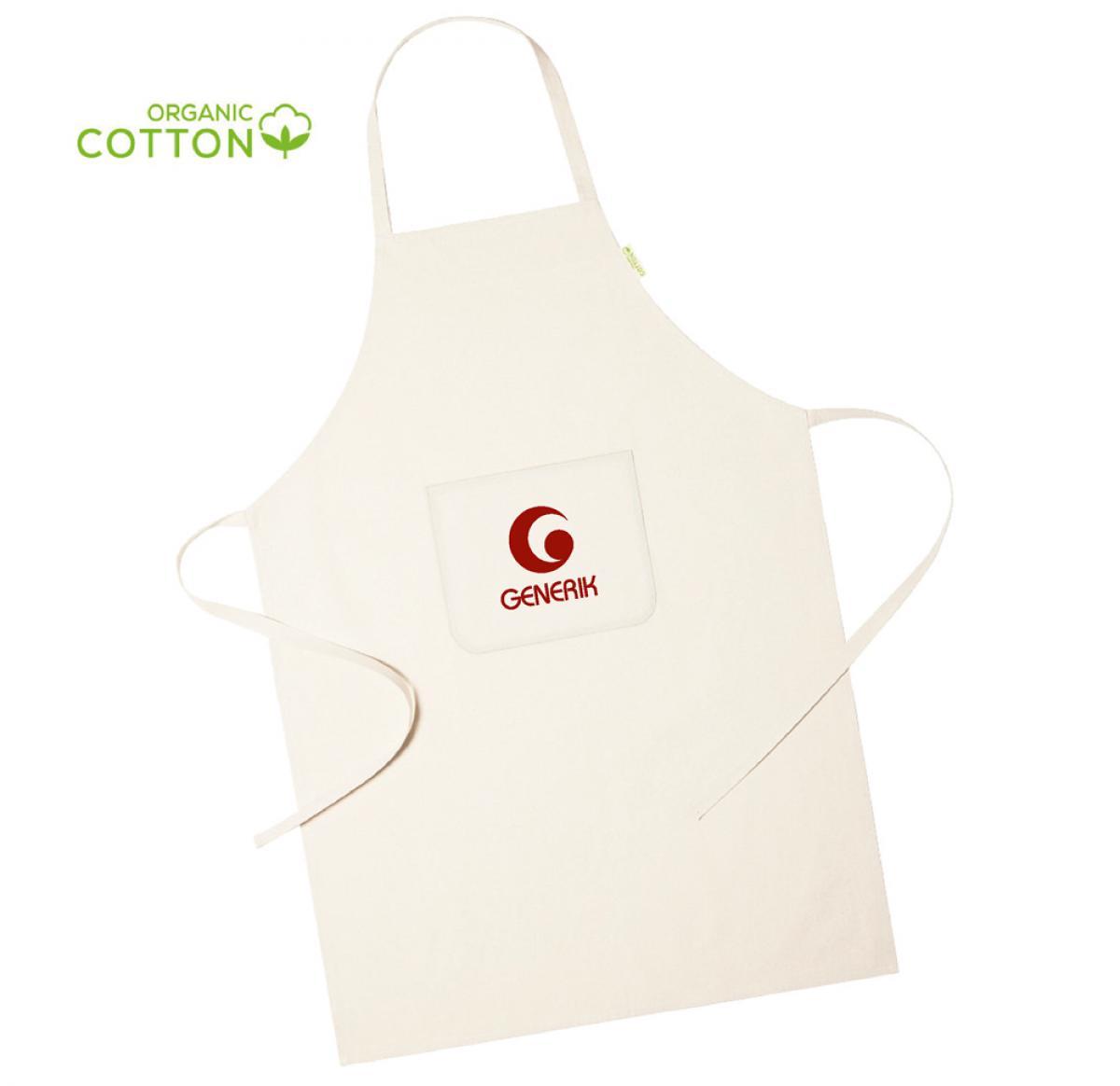 Nature line apron, manufactured in 100% organic cotton material. With front pocket and adjustment straps, fitting under the knee. Organic cotton distinctive in label.