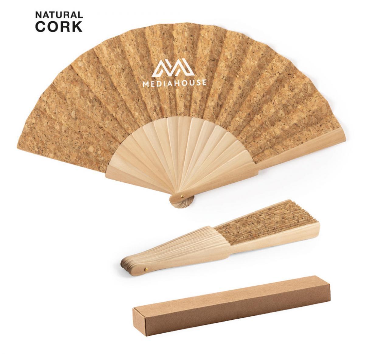 Nature line fan with wooden ribs and natural cork fabric. Presented in an individual, eco design box.