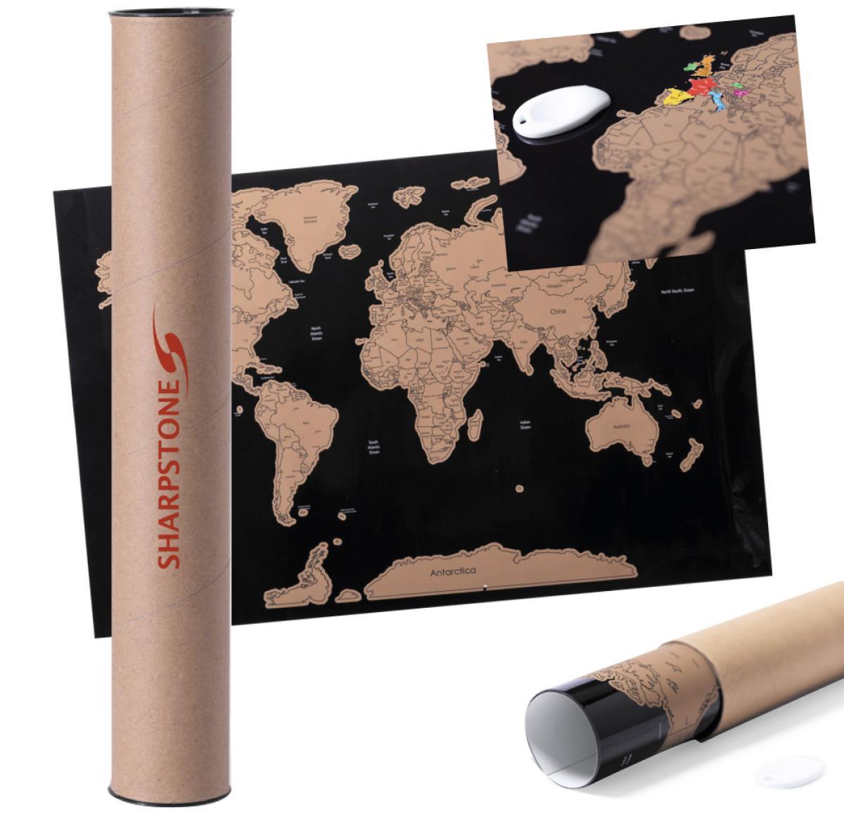 This travel-sized, laminated paper scratch off global map with included scraper is a must have for travel enthusiasts and adventurers. Supplied in a protective reinforced cardboard tube, this interactive map of the Earth is the perfect gift for those with wanderlust who may have a number of countries under their belt already or who may be setting off on the trip of a lifetime. Simply scratch off the Bronze-coloured foil once you’ve visited a country to reveal the coloured paper underneath. An ideal give away for travel agencies and souvenir shops.