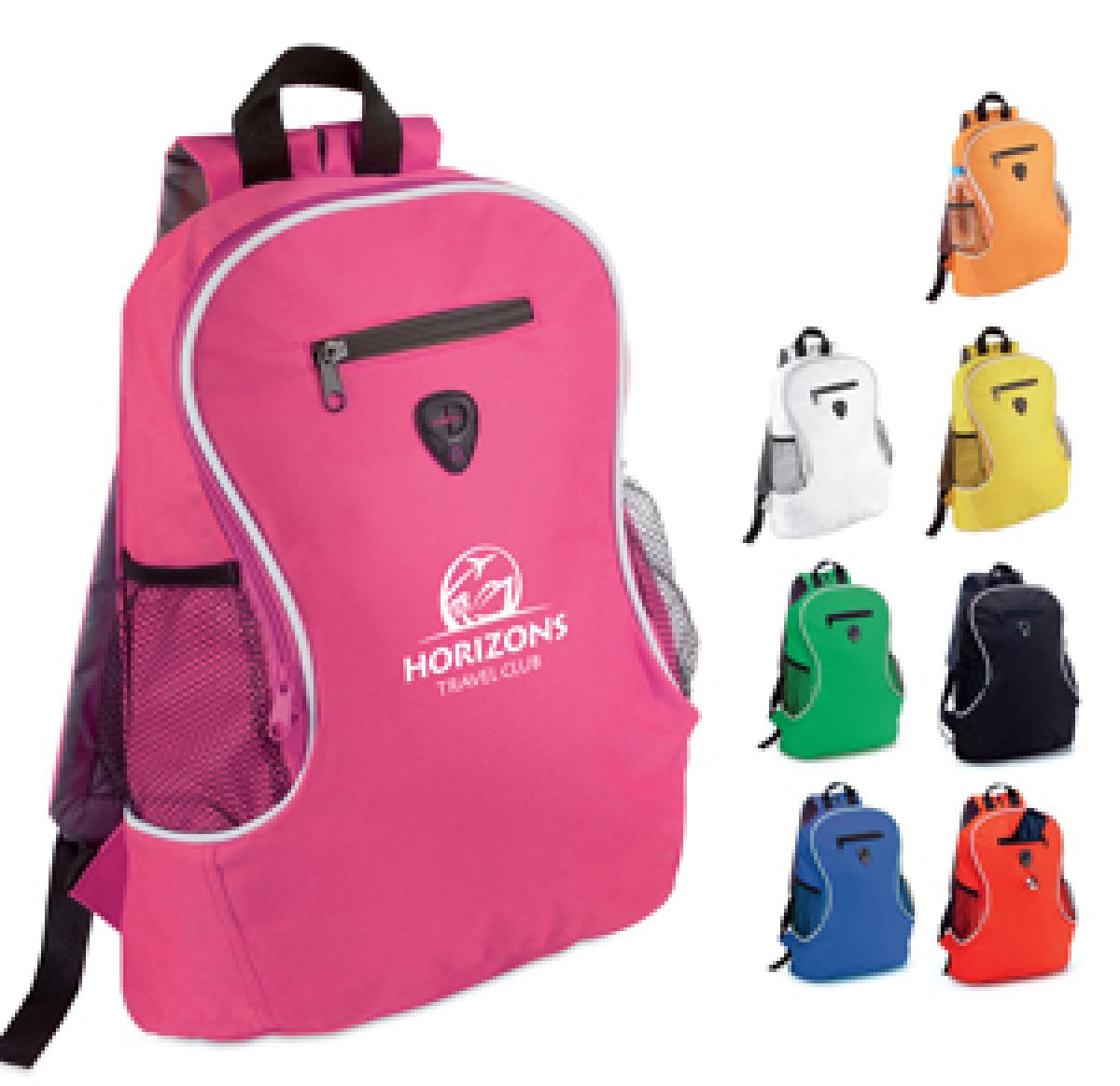 600D Polyester sports rucksack supplied with zipped main compartment, side net pockets, zipped front pocket and earphone opening. Great for everyday travel.