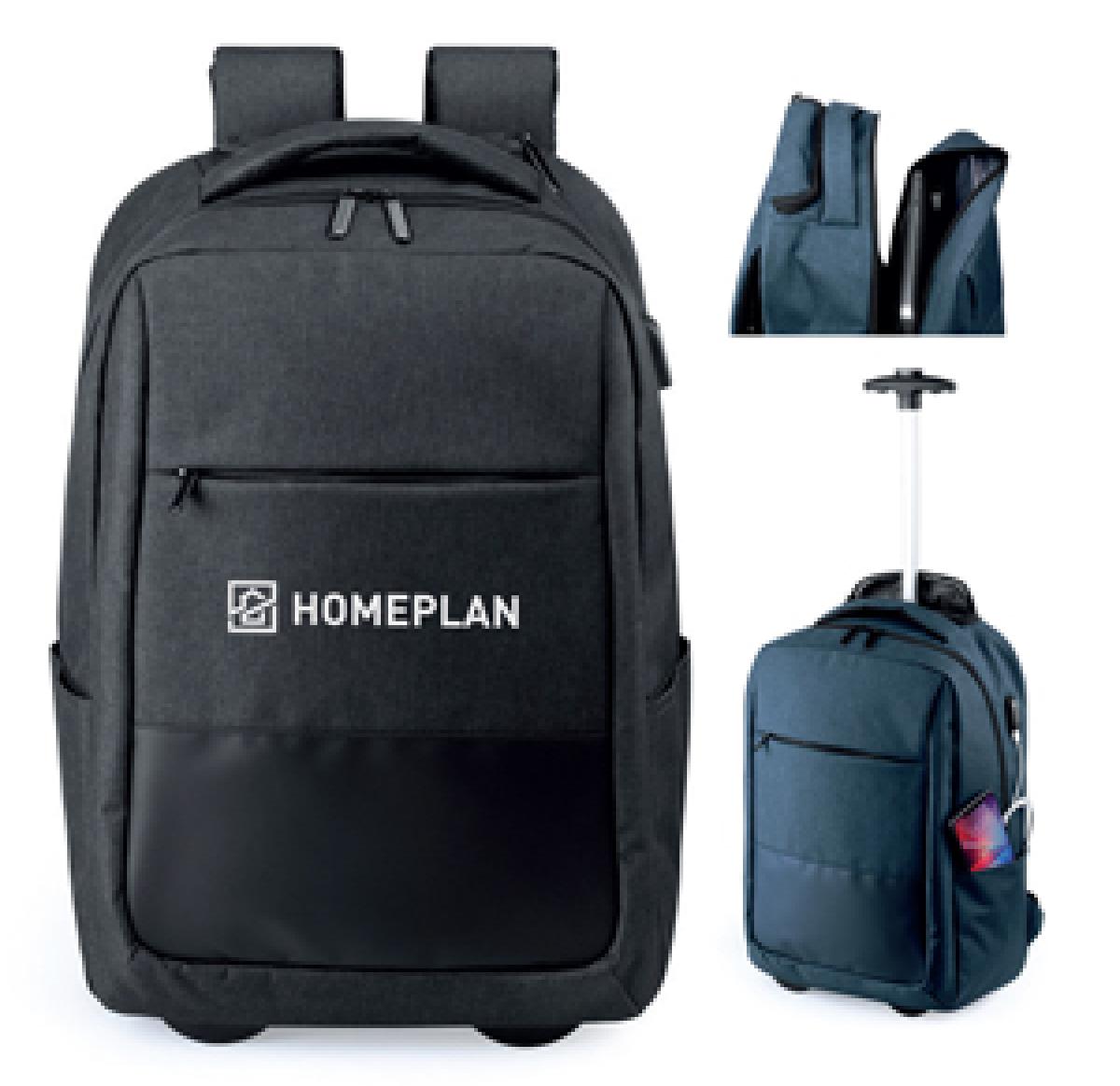 Resistant polyester 300D versatile backpack trolley with USB charging port (power bank not included) for charging tablet and mobile devices on the go. Which can be used a backpack or trolley. A variety of compartments are handy for convenient storage which include inner padded pocket for laptops up to 15 inches, inner compartment for tablets up to 10 inches, main pocket with double puller, front and side pockets, and trolley mechanism compartment Padded back and adjustable shoulder straps with padding are designed for comfort. Supplied with wheel cover accessory with Velcro fastening for comfort while using as a backpack. Great for leisure or business travel.