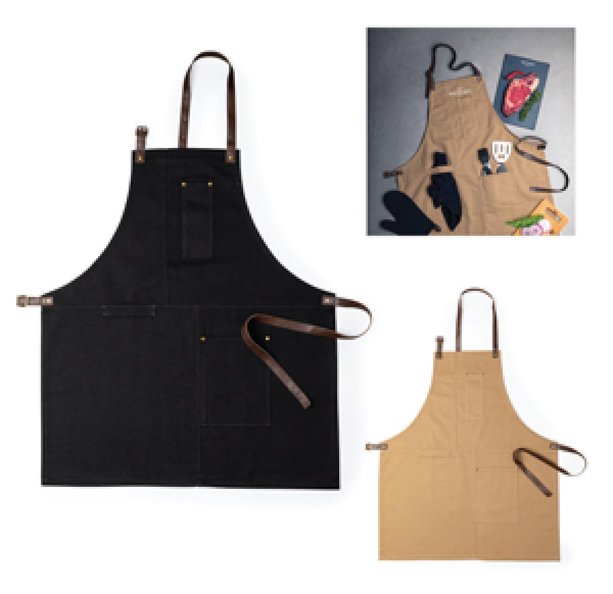High quality apron in 100% cotton canvas up to 340g/m2 with neck and waist straps in PU leather, straps designed with buckle adjustments and reinforced metal rivets. This professional apron is fitted to below the knee and is perfect for restaurants, bistros and café’s.