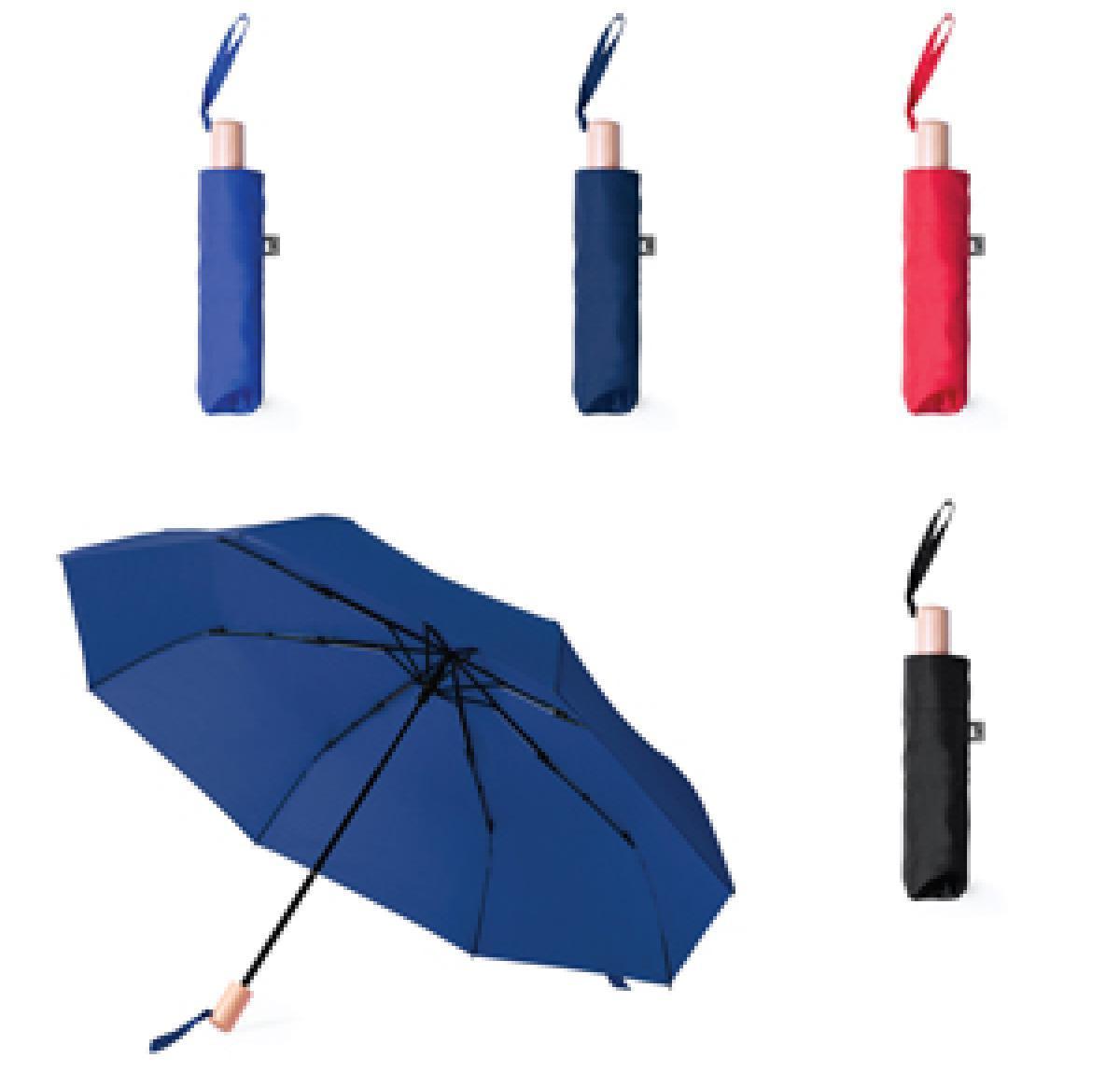 Eco 42” folding umbrella made from durable 190T pongee RPET material obtained from recycled plastics to encourage sustainability. This resistant umbrella is windproof with manual opening with metal ribs, a wooden handle and carry pouch with strap in matching colour.
