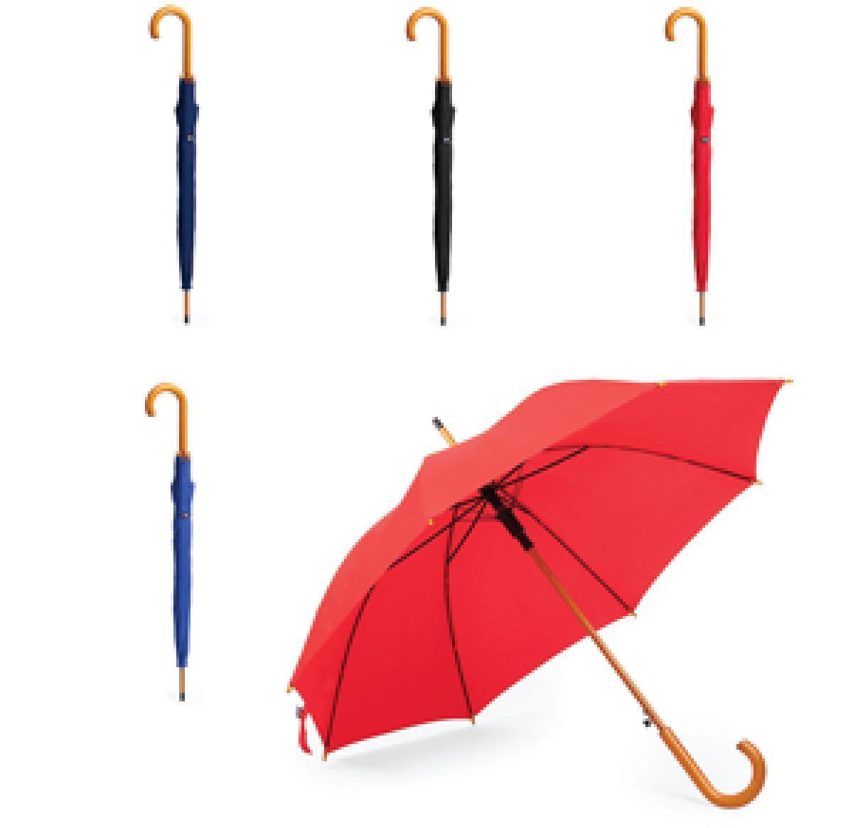 Eco 46” crook handle umbrella made from durable 190T pongee RPET material obtained from recycled plastics to encourage sustainability. This resistant umbrella is windproof with automatic opening with metal ribs and a wooden crook handle.