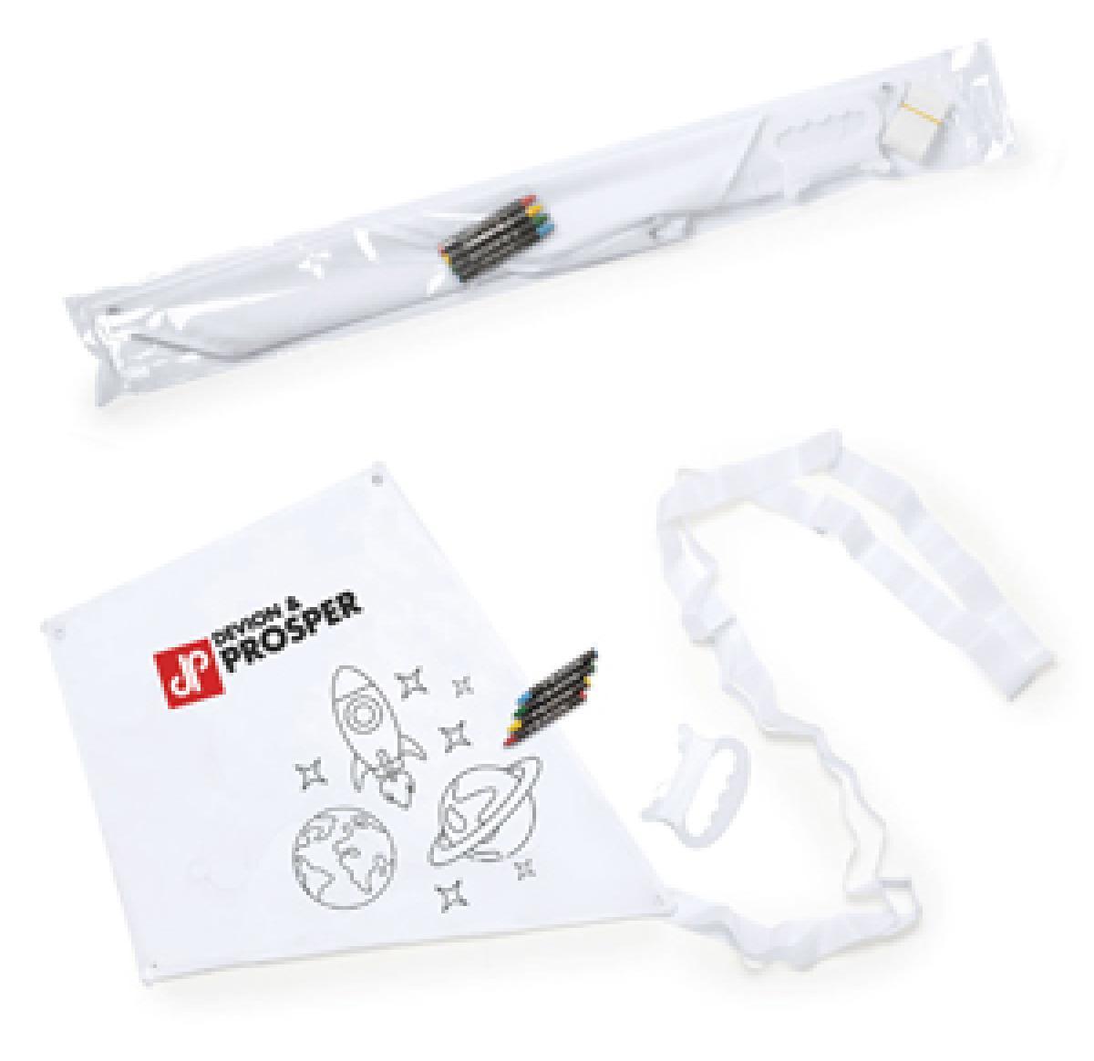 Fun kite for flying and painting in resistant 190T polyester. 4 crayons included.