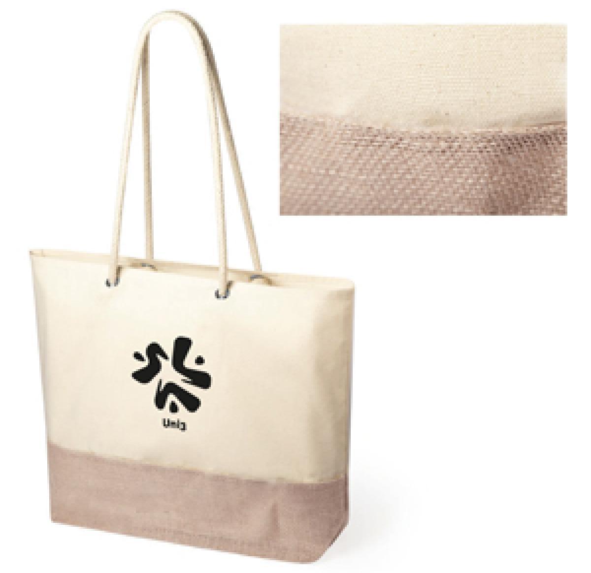 Nature line bag in combination of jute and cotton materials. Size 48 x 35 + 15 cm, with stitched finishing and long, reinforced handles 90 cm length in cotton. Resistance up to 9 kg weight.