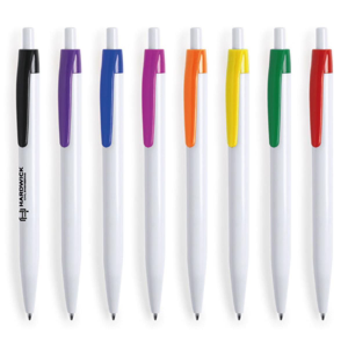 Ball pen with push-up mechanism in an eye-catching, two colour design. Body in white colour and clip in a wide range of colours. Wide printing area and blue ink refill.