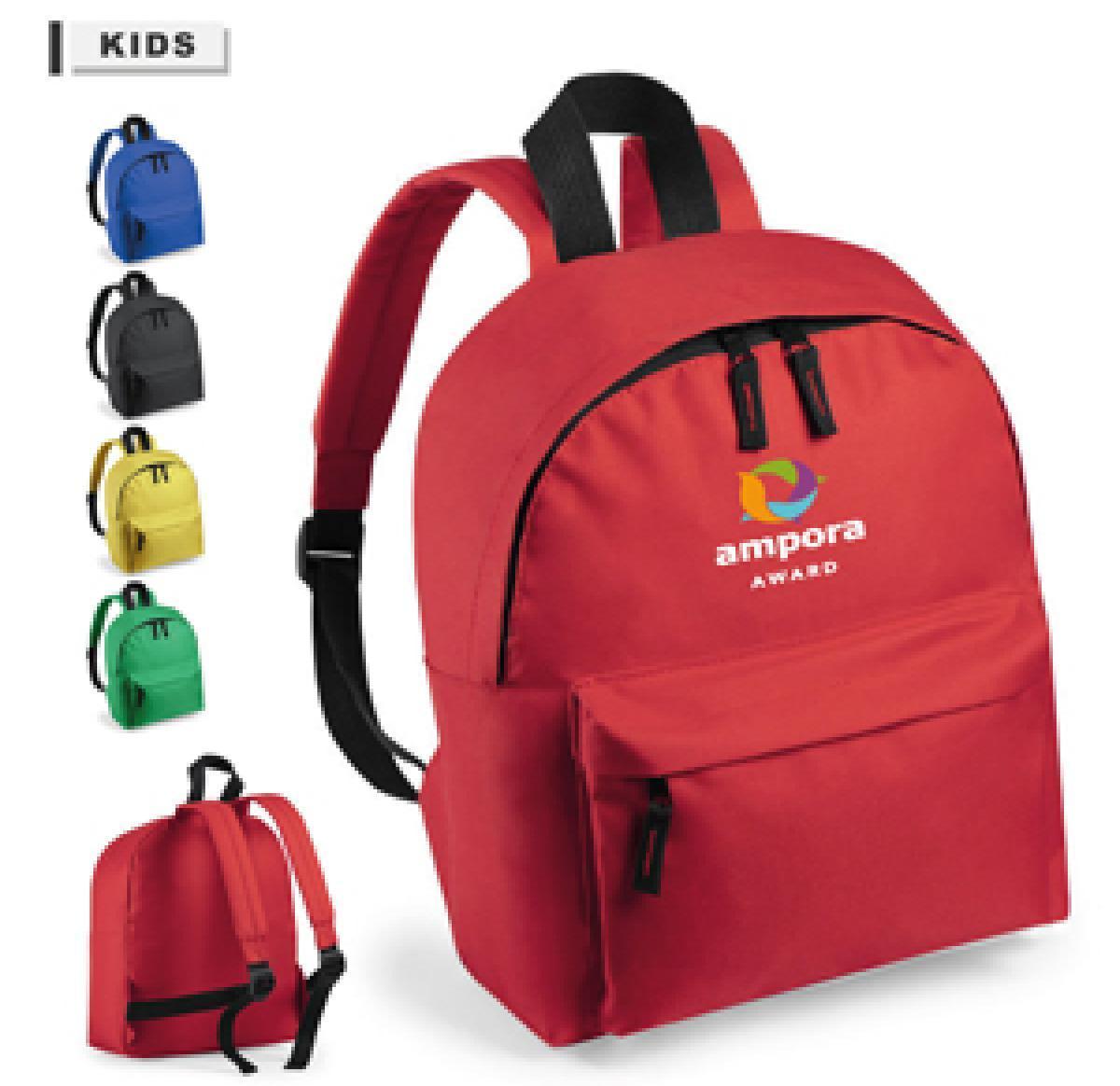 Leisure backpack for kids in resistant polyester 600D material, available in a wide range of vid colours. With double puller zipper pocket and front pocket. Reinforced corners and accessories in black colour. With padded back and adjustable, padded, shoulder straps.