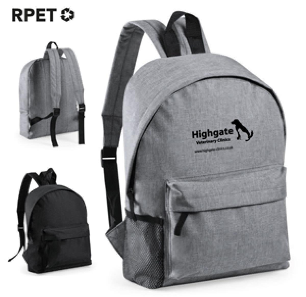 Backpack in resistant 600D RPET material, obtained from recycled plastic materials, to encourage the reusing of plastic residues and contribute to the Earth’s sustainability. With zipper closure and front pocket, reinforced corners, pullers with straps for easy opening and accessories in black colour. Padded back and adjustable shoulder straps. RPET distinctive in label.