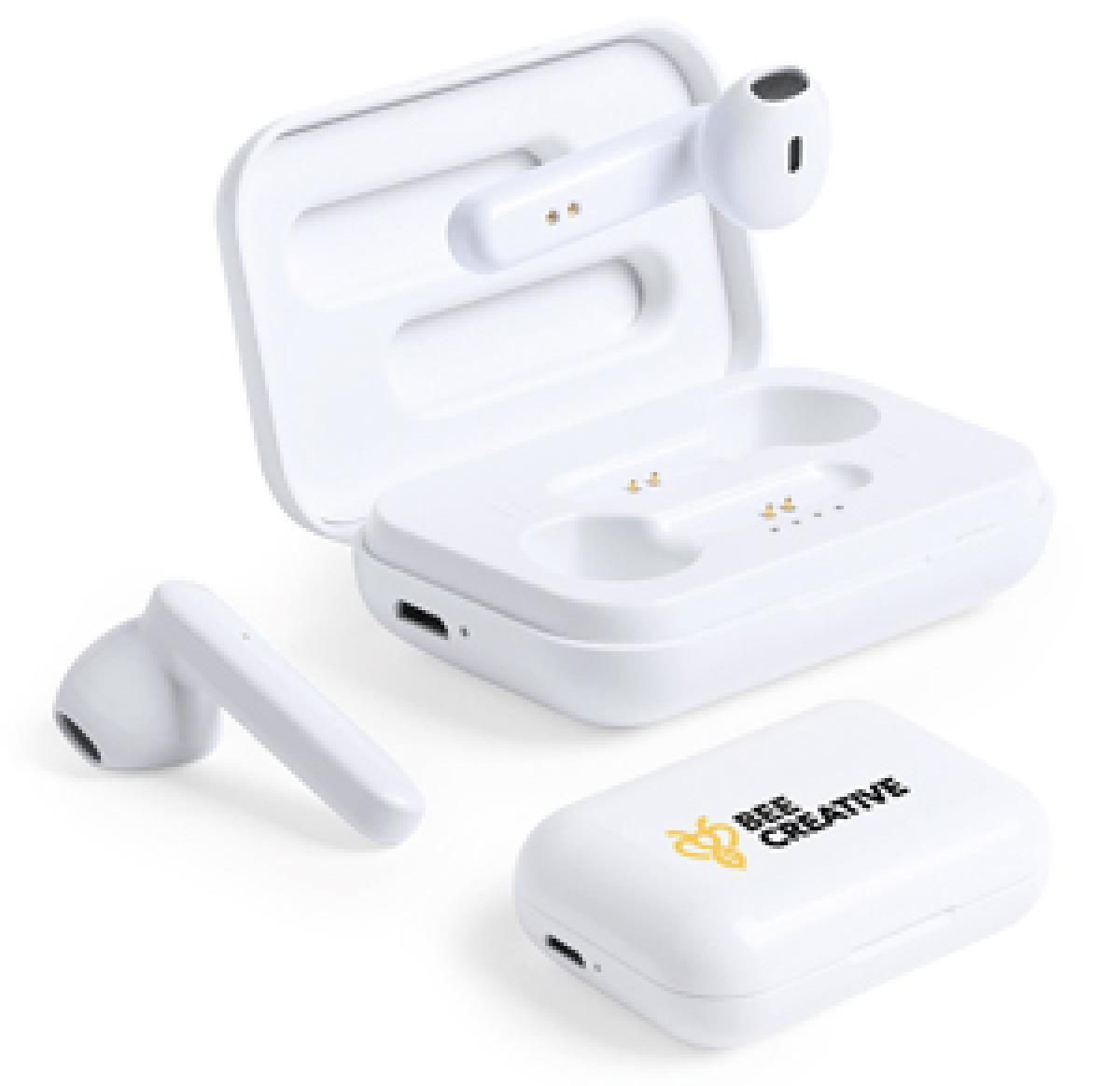 Earphones with Bluetooth® 5.0 connection in an elegant white colour design. Ergonomically designed, including an integrated, touch control panel in the earphone, with matching colour charging base. Hands free function and rechargeable. Micro USB cable included. Presented in an individual deluxe case with hinged cover and in an attractive design box.