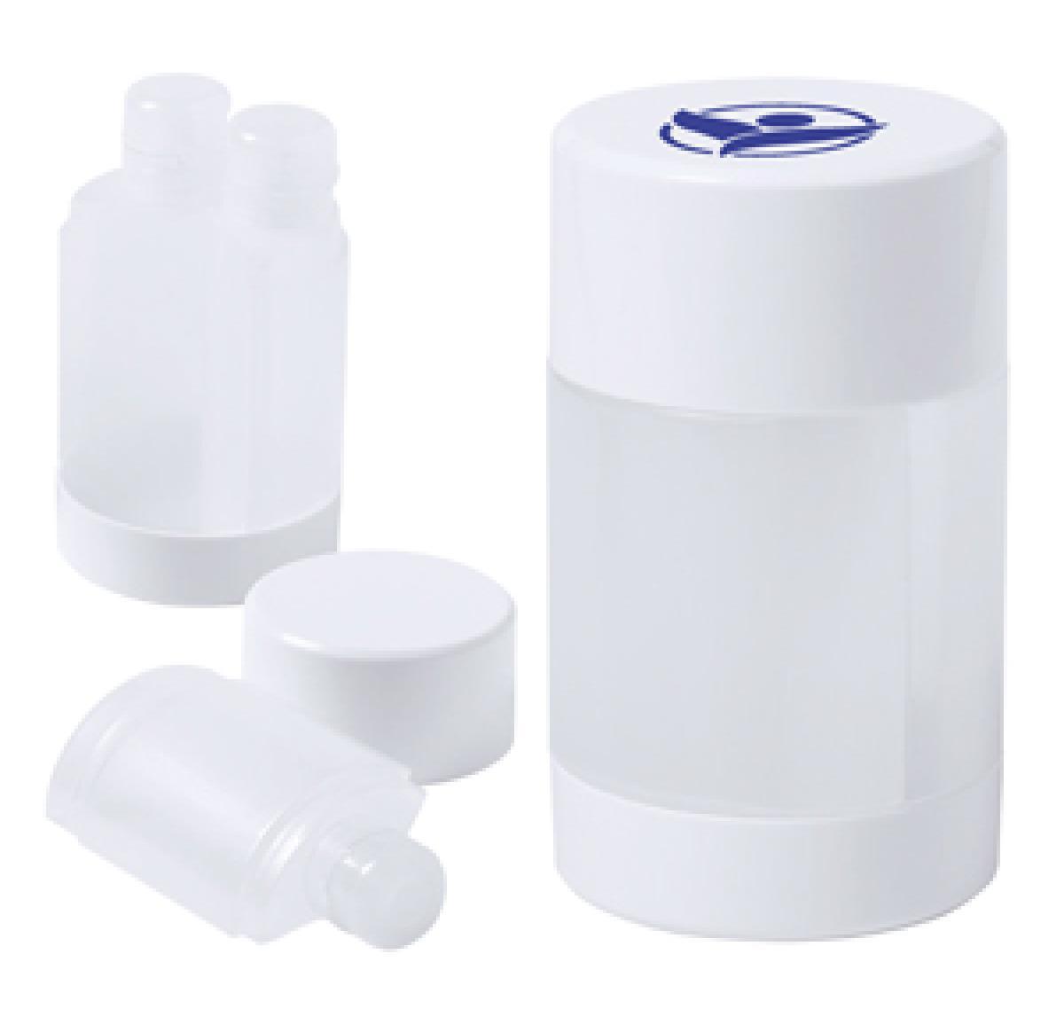 Travel set of 3 accessories in resistant PP material. Including 3 bottles with watertight closure. Presented in an eye catching case.