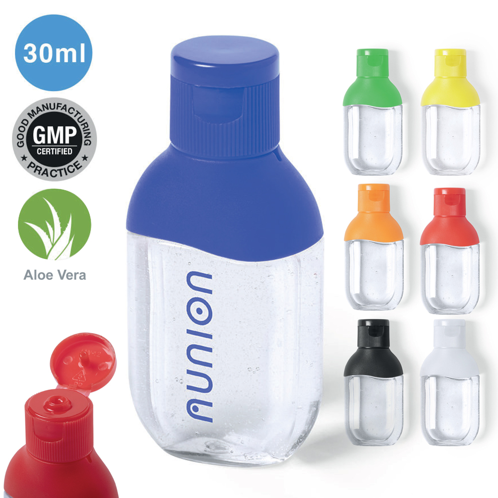 Hydroalcoholic gel for hygiene and skin cleansing in a 30 ml refillable bottle, with balsamic Aloe Vera extract. Transparent body with detail and solid finish cap, in a wide range of colours. With dispenser and safety cap. Solution with 65% alcohol content. 94/62/EC certification available. Article with GMP (Good Manufacturing Practices) certification that guarantees the fulfilment of rigorous control measures to obtain a safe and quality product.