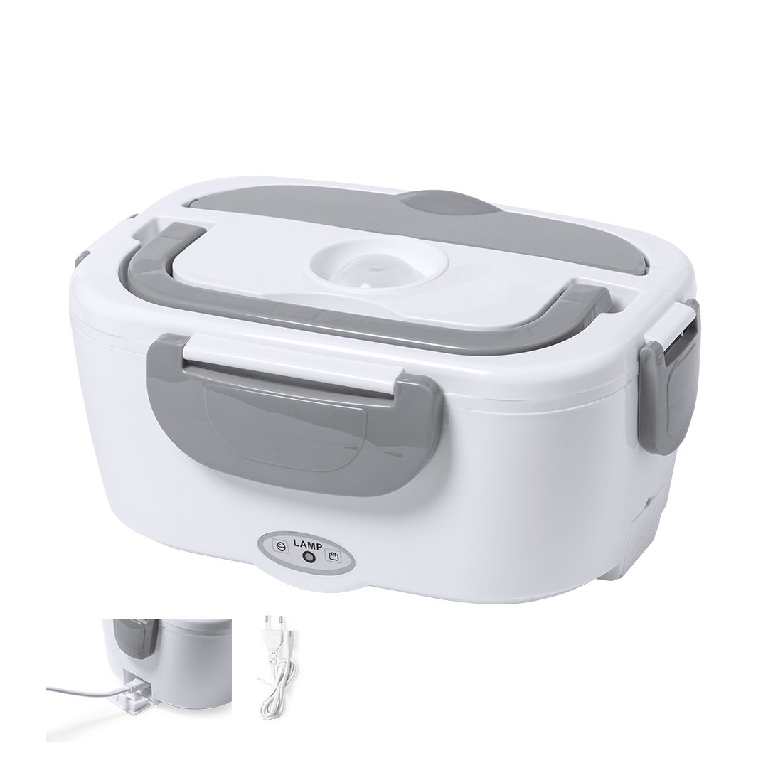 Electric lunchbox with 1l capacity . Manufactured in resistant BPA-free ABS and in a two-colour design. Includes practical carrying handle and waterproof lid with side safety locks. 2 main compartments and auxiliary compartment with hermetic closing. Spoon included, with power cable for European plug. Ideal for heating food at the office. Presented in an attractive design box.