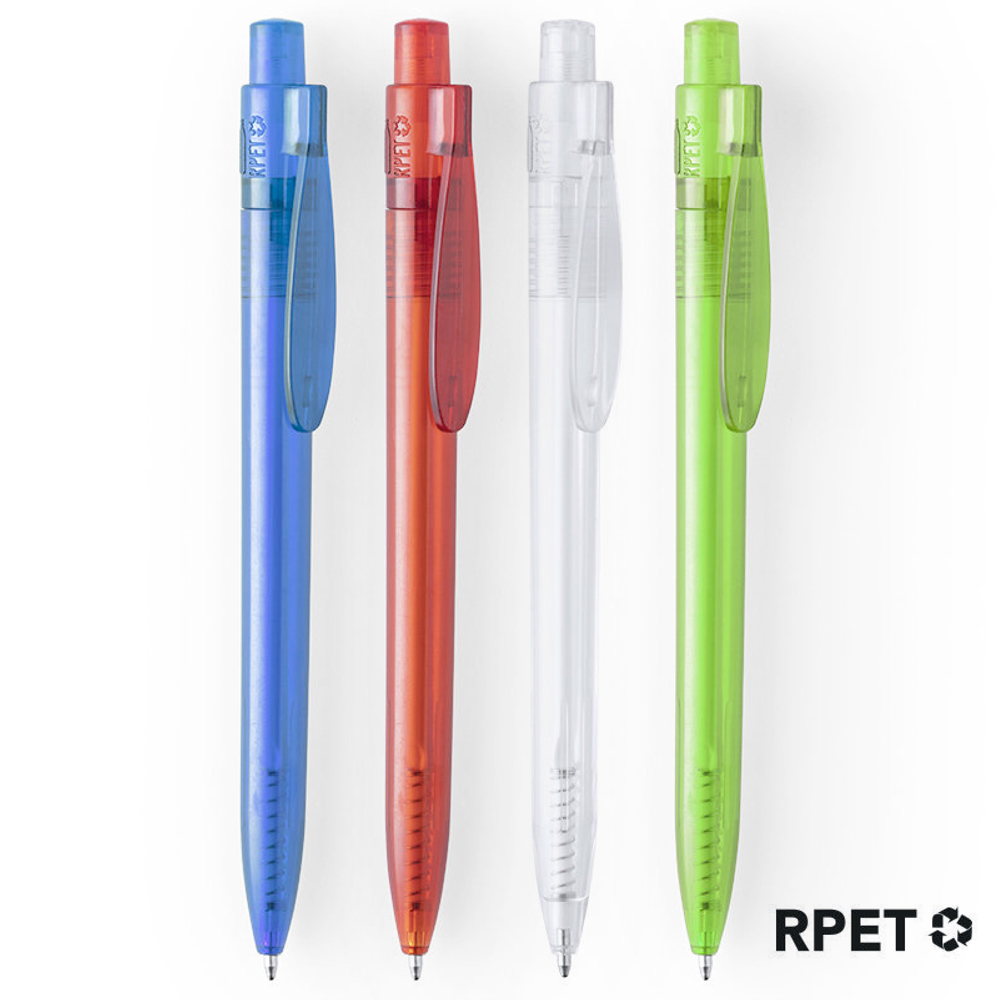 Nature line pen in RPET material, made from recycled plastic to encourage the reuse of plastic waste and help the sustainability of the planet. Translucent finish and original clip, with the RPET logo on the body of the pen and available in a wide range of colours. Specially designed for pad printing, with push-up mechanism and blue ink.