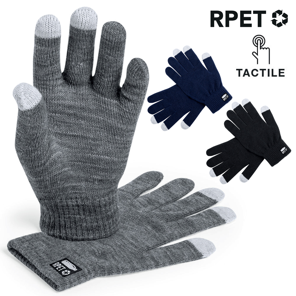 Practical pair of nature line gloves for touch screen devices. Warm and soft RPET polyester finish, made from recycled plastic to encourage the reuse of plastic waste and contribute to the sustainability of the planet. Touch function on middle, index and thumb. One size fits all, with RPET logo on outer label.