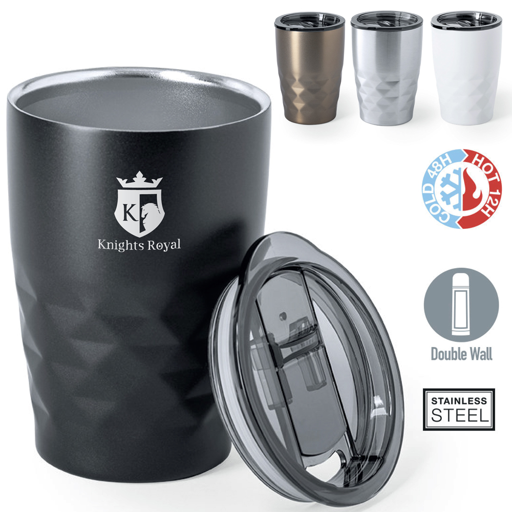 Stainless steel thermal cup, with double layer and copper vacuum insulation. It allows you to maintain heat and cold for a longer time, reaching 8 and 24 hours respectively. With a capacity of 350ml, and available in a wide range of metallic colours. Presented in an attractive design box.