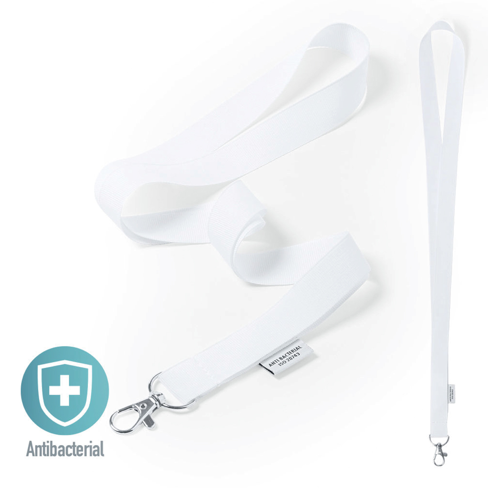 Antibacterial lanyard in white polyester with metal carabiner. Products with antibacterial treatments are able to drastically reduce the bacterial loads present on the surfaces of the materials, thanks to the incorporation of permanent static microbial agents, with high effectiveness in inhibiting and preventing bacterial contamination. Article according to the ISO 22196 standard, which determines the antibacterial activity in plastic materials and non-porous surfaces, which allows us to know the effectiveness of microbial inhibition that the additives have on the treated objects by means of a quantitative evaluation.