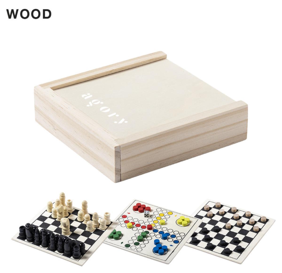 Nature line game set. Including chess, parcheesi and draughts. Set presented inside a wooden case, with 2 sliding boards.