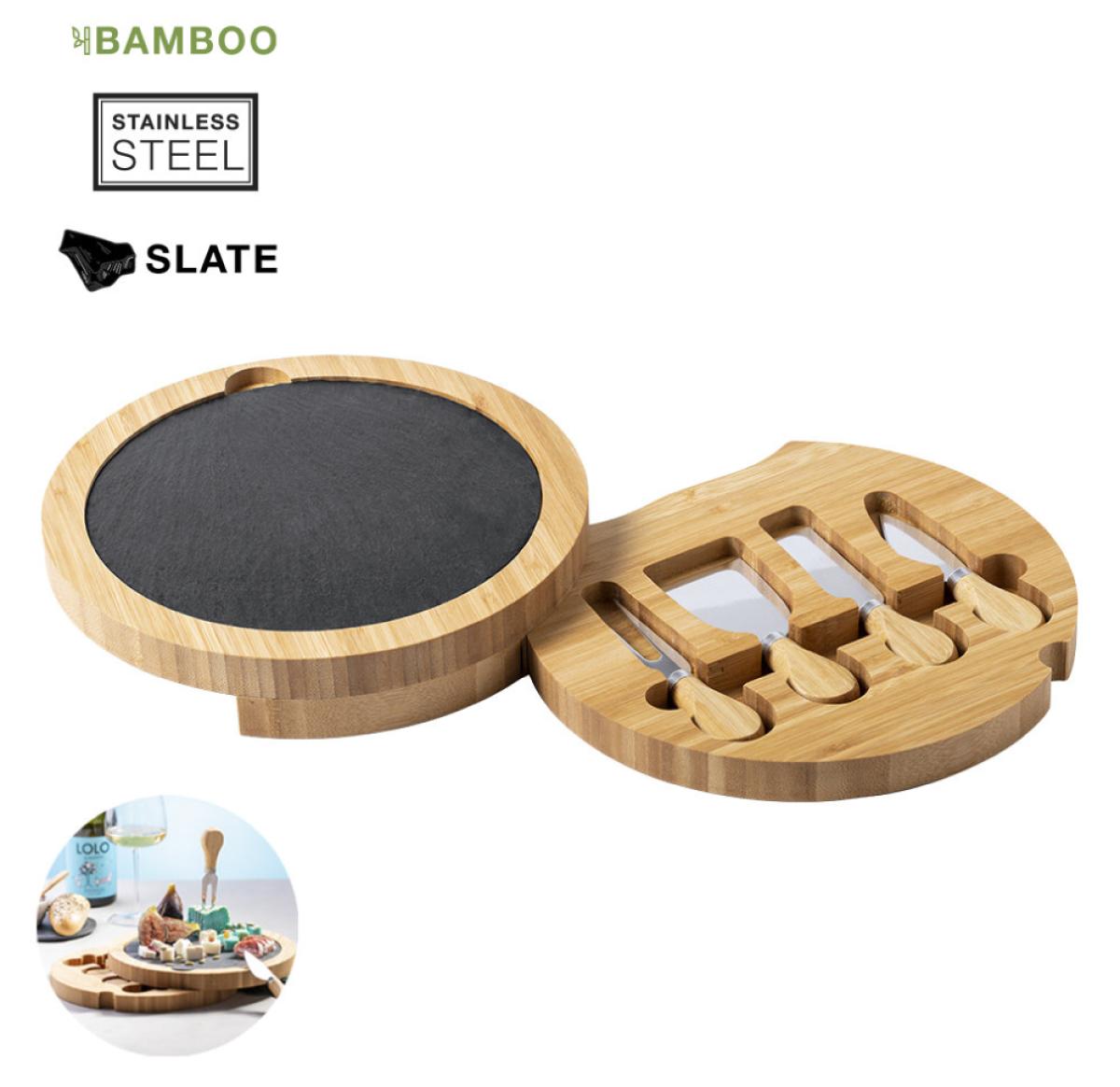 Fully equipped, 4-piece cheese set. Cutting and presentation board made of slate, removable for easy cleaning. Stainless steel utensils and bamboo handle. Presented in an individual, bamboo die-cut case and attractive eco-design individual box.