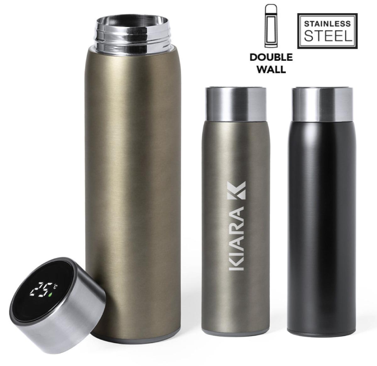 Stainless steel, double wall, thermal bottle, with touch-sensitive temperature gauge integrated in the lid. 500ml capacity and matt finish. With BPA free safety lid and presented in an attractive design box. Battery powered (button cell included) and instruction manual available in English and Spanish.