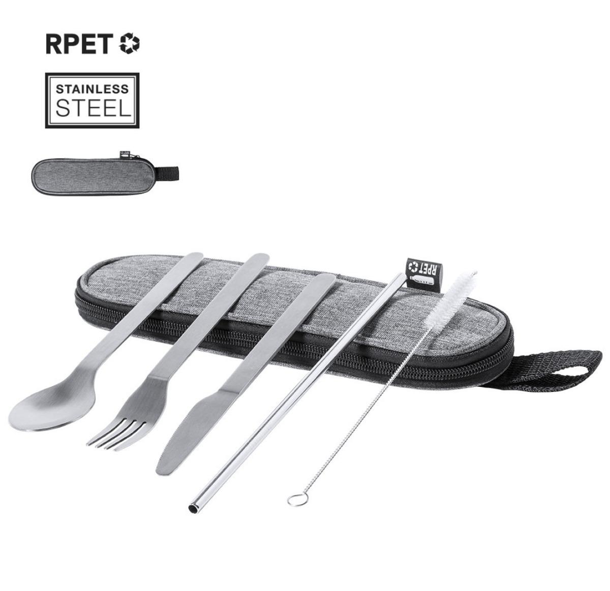 Reusable cutlery set made of strong and durable stainless steel. Including spoon, knife, fork, straw and cleaning accessory. Presented in an elegant, individual 300D RPET polyester case made from recycled plastic, to encourage the reuse of plastic waste and help the sustainability of the planet. Presented inside an individual case with carrying strap, zip closure and RPET emblem on outside label.