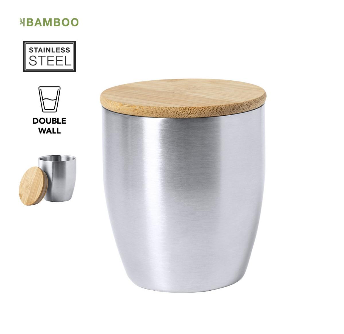 Stainless steel thermal cup, with double wall and 280ml capacity. Lid made of bamboo and presented in an attractive eco-design box.