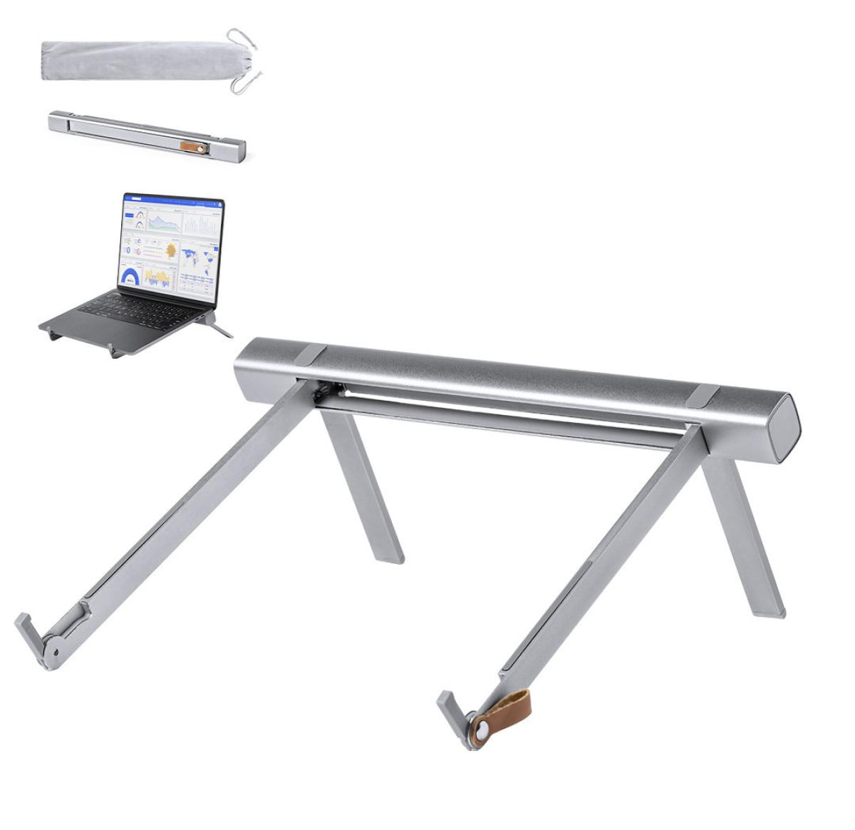 Premium quality folding laptop stand. Made of heavy-duty aluminum and including extendable, height-adjustable legs with rubber pads for a solid fit to the computer and desk. Compact folding size, presented in a suede pouch with drawstring closure and inside and individual, design box.