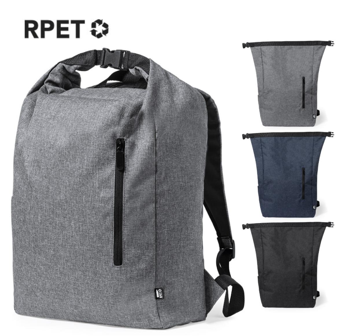 Nature line backpack made of durable 300D RPET, made from recycled plastic, to encourage the reuse of plastic waste and contribute to the sustainability of the planet. Main pocket with buckle closure and side pocket. Adjustable padded shoulder straps and RPET emblem on outside label.