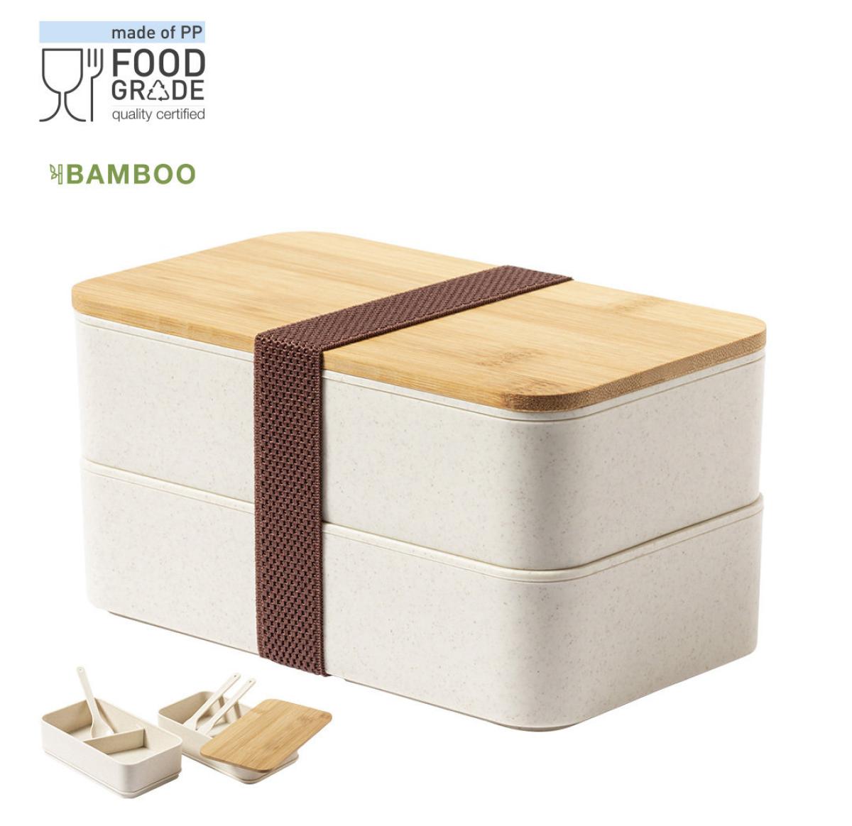 1.4L lunch box in resistant BPA-free veined PP material, with bamboo lid. Two compartments, each with a capacity of 700ml. Inner compartment with fork, spoon and knife. Including outer safety strap. Food Grade certified, guaranteeing safety when food comes into contact with the material used to manufacture the product.