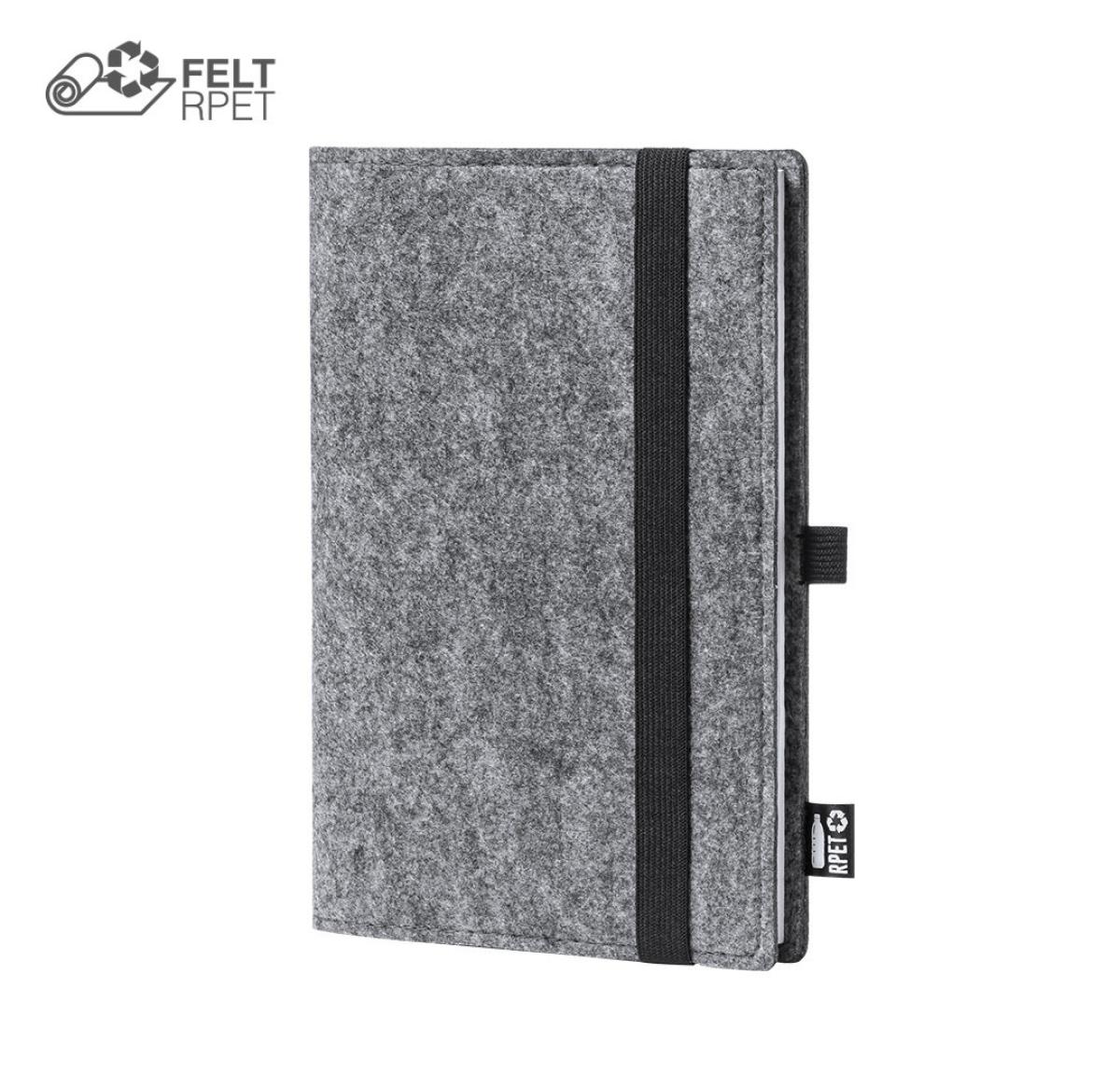 A5 nature line notepad with RPET recycled felt cover. The result of the combination of the recycling processes of plastic materials along with the millenary technique of felt manufacturing, resulting in an eco-trend material that, in addition to being of recycled origin, also becomes recyclable. Including 100 plain sheets. With elastic band, pen holder and RPET label on cover.
