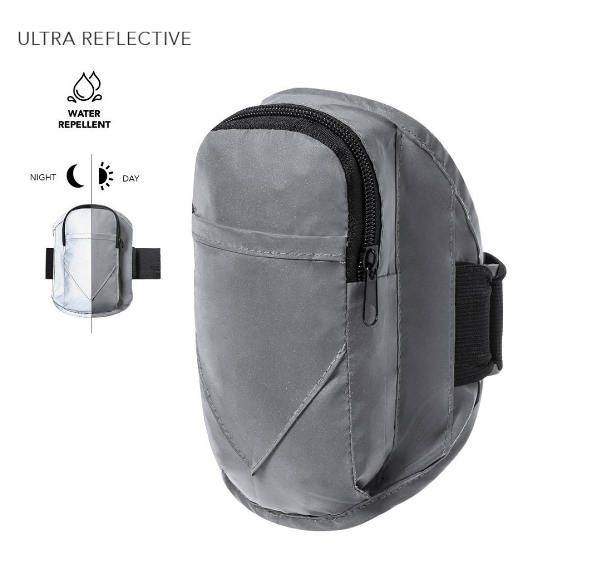 Sports armband in 210T polyester. Made using highly reflective fabric, based on the principle of retro-reflection of light, a property of nighttime visibility that consists of the refraction of light back to its source of origin. Zippered main pocket and front pocket with velcro closure. With adjustable, elastic strap and water resistant.