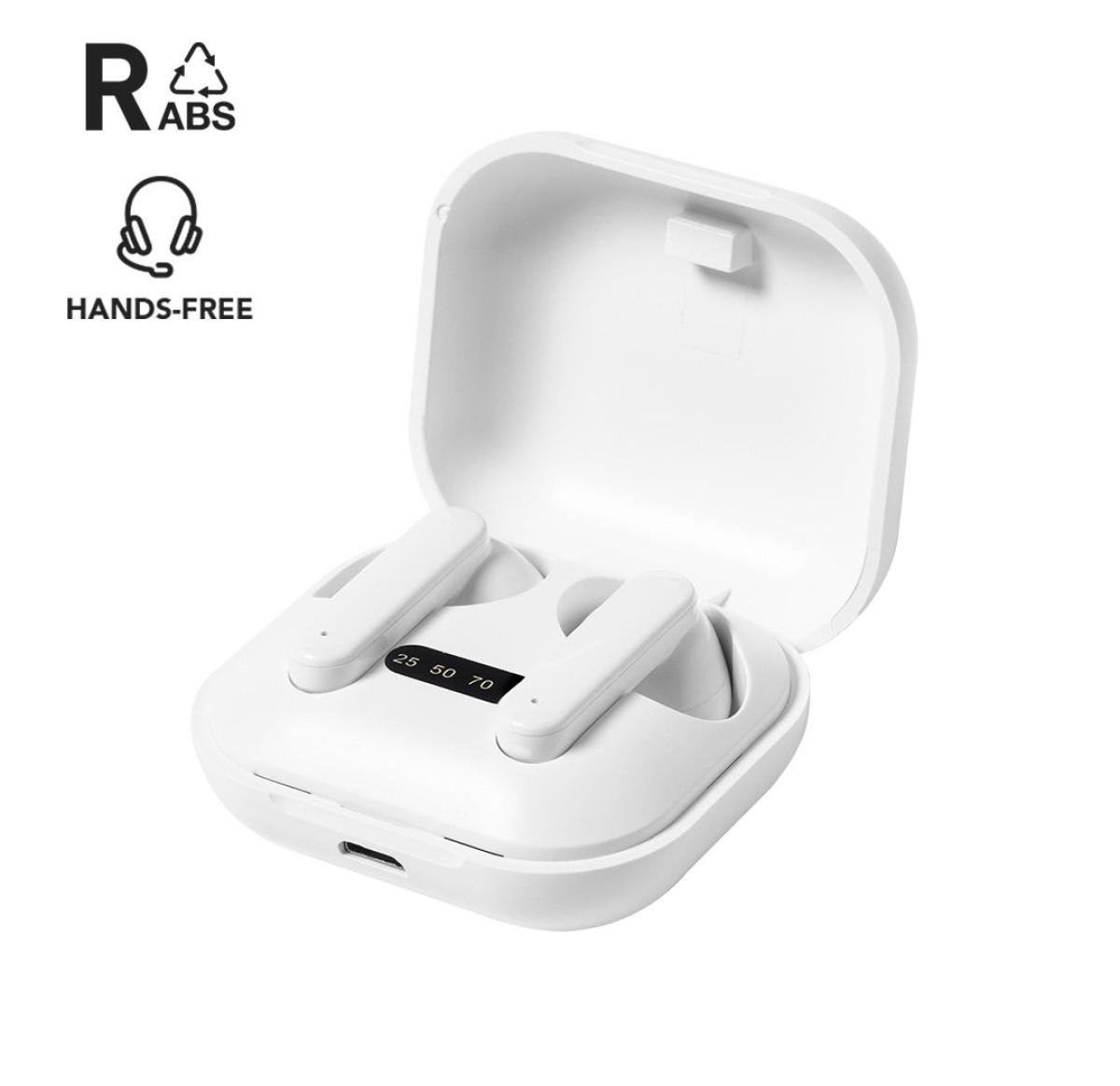 Nature line earphones with Bluetooth® 5.0 connection, including lithium battery and in an elegant white finish. Made of recycled ABS (RABS), with RCS certification, guaranteeing its recycled origin. Ergonomically designed, including an integrated control button on the earphone, with matching charging base and LED charging status indicator. Hands-free function and rechargeable, with micro USB cable included. Presented in an attractive eco-design box.