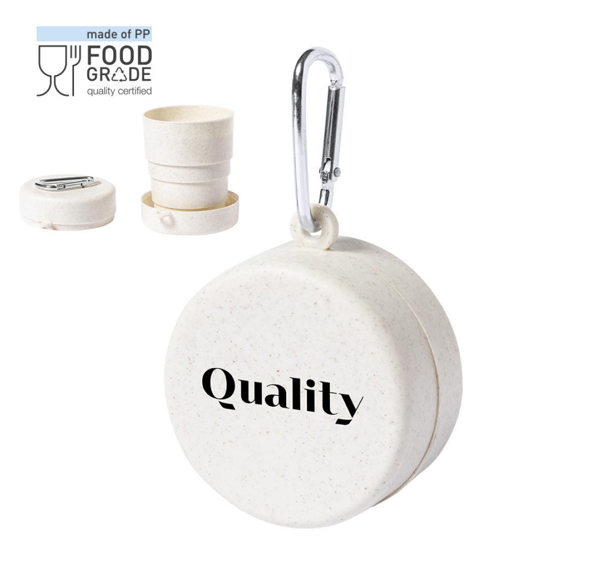 Unique folding cup for emergencies, made in BPA-free veined PP. Capacity 220ml, with metal carabiner for transport. Food Grade Certification, guaranteeing safety when food is in contact with the material used to manufacture the product.