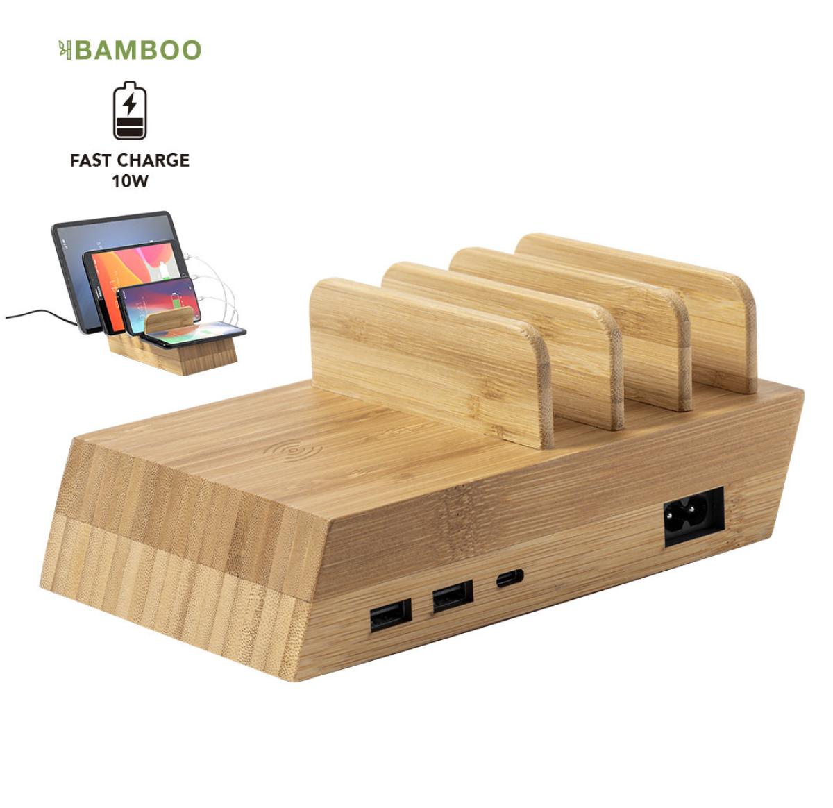 Nature line wireless charging station, multi-device and 10W charging, capable of charging up to 4 devices simultaneously. Made of bambo and including 2 USB and 1 Type-C outputs. Compatible with devices equipped with wireless charging technology. 150 cm connection cable, with European plug and a wide branding surface. Presented in an attractive eco-design box, with instruction manual available in English and Spanish. Compliant with safety requirements: Overheating protection system. Overcharge protection system. Blocking system to prevent short circuits.