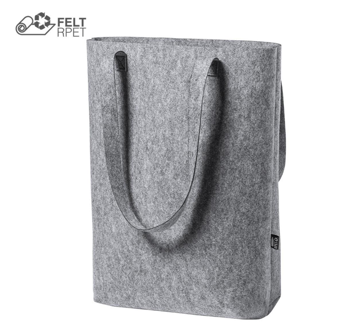 Nature line bag in resistant, recycled RPET felt. The result of the combination of the recycling processes of plastic materials along with the millenary technique of felt manufacturing, resulting in an eco-trend material that, in addition to being of recycled origin, also becomes recyclable. Rectangular design, with gusset at the base, extra long and extra wide reinforced handles (70 x 3.5 cm). Resistance up to 6kg, with RPET emblem on outside label.