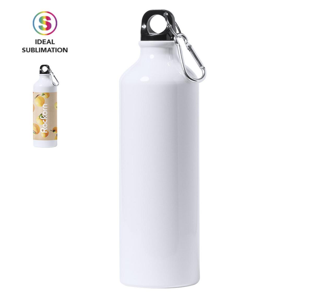 800ml capacity, aluminium bottle. Finished in soft and glossy white, specially designed for sublimation printing. With screw-on safety lid and metal carabiner for transport. Presented in an attractive design box.