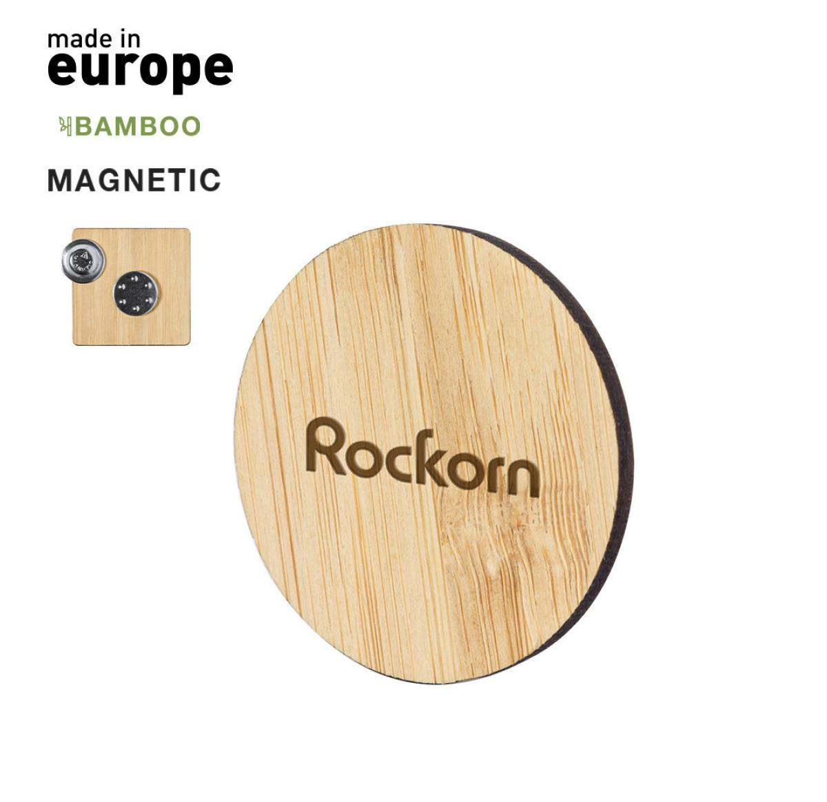 Nature line pin, made of bamboo from natural cuttings. Made in Europe and available in circular and square designs, with magnetic pin.